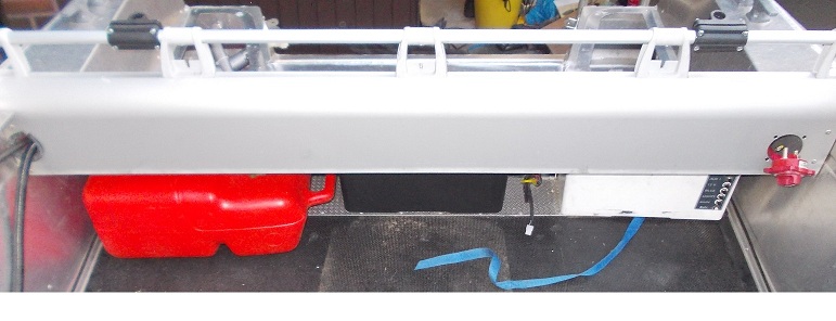 Vaihtoehtona oli kiintotankin tekeminen, mutta synnynnäisesti laiskana näytin rälläkkää, puukkosahaa ja hitsiä moottorikaivolle, jolloin irtotankki, 90Ah ja 70Ah akku sopivat tulevan klaffin taakse. Tilaa jää myös parille uistinpakille. Keulamotti painaa 25kg kuten uusi takana oleva akkukin eli vene kelluu samassa asennossa kuin ennen operaatiota.