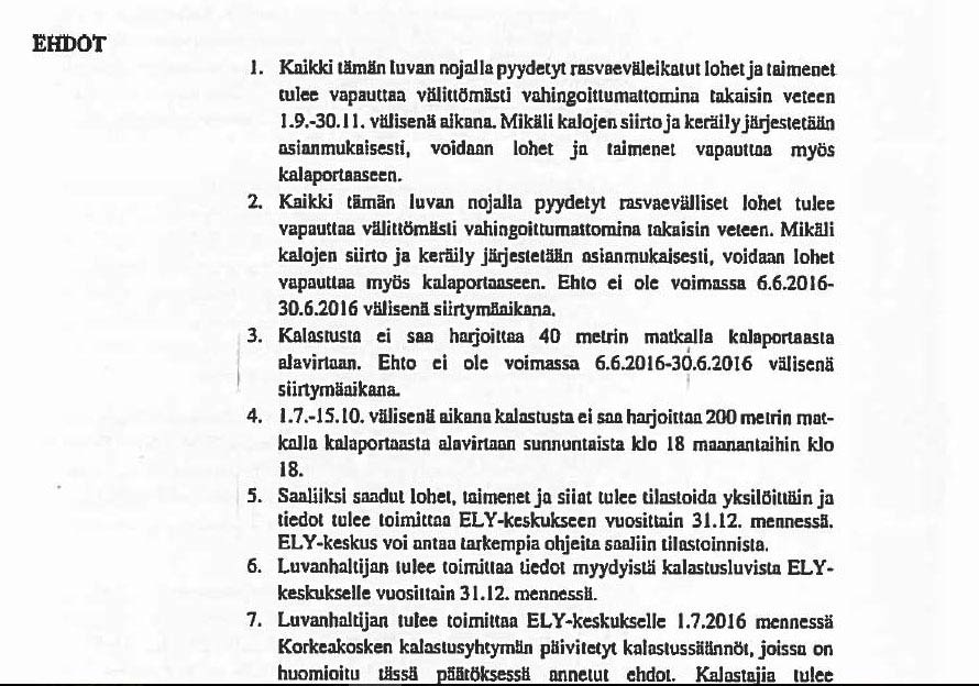 Liitteet poikkeusluvista.paanaz kirjoitti:200m kalaportaan ylä ja alapuolella on kaikenlainen kalastus kielletty. Yleensä on ELY-keskukselta haettu ja saatu poikkeuksia näihin rajoituksiin.