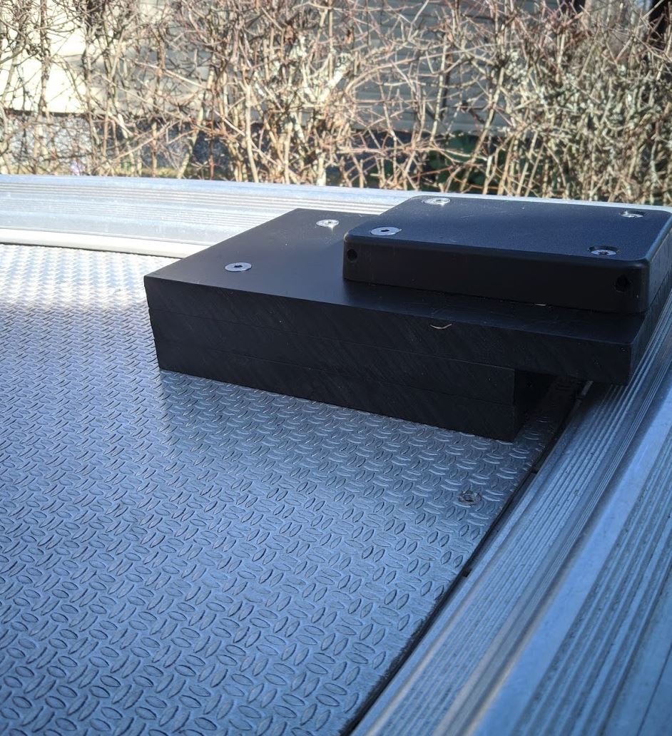 Alusta on tosiaan kiinni myös pikajalustan alta vastaavilla läpipulteilla kuin alustan reunakiinnityksessä. Isompia läpipultteja on siis piilossa 2 kpl pikajalustan alla. Kuvassa ja kuvaushetkellä ei pikajalustassa ole vielä läpipultteja kuin 2 sisemmässä reiässä, jotka ovat myös kiinnitetty kannen/alustan läpi. Etupuolen reiät tulivat kiinni merialumiinilevyn alapuolta, joten prikat ja lukkomutterit ovat etummaisessa kiinnityksessä levyn alapuolella. Aluslevyn kiinnityskohdassa veneen kansi taittuu hieman viistosti alaspäin aina keulaa kohden mentäessä, jolloin kaarevuus aiheutti levyn koolle ja muodolle omat rajoitteensa esim. varsinkin kiinnityspisteille. Sikaflexillä pienen tasoeron pystyy kiinnitysvaiheessa korjaamaan, mutta suuri tuo ero ei toki saa olla eli aluslevyn pitää asettua kiinnityskohtaan tasaisesti. Tässä kohtaa projektiin valmistunut aluslevy on kuitenkin aivan riittävän iso pikajalustaa varten ja aluslevyn levittäminen suuremmalle alueelle ei olisi tuottanut sen suurempaa hyötyä tukevuuden osalta -> levy ei notku tai heilu, vaikka siinä roikkuisi päällä (testattu).