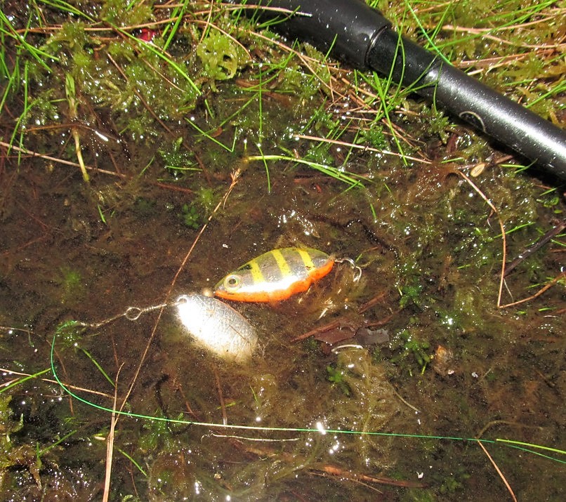 yksi irtosi. sotkeutui lumpeikkoon. kahdesti. toisella kerralla irtosi kalakin. hauki, vai.. isompi ahven..