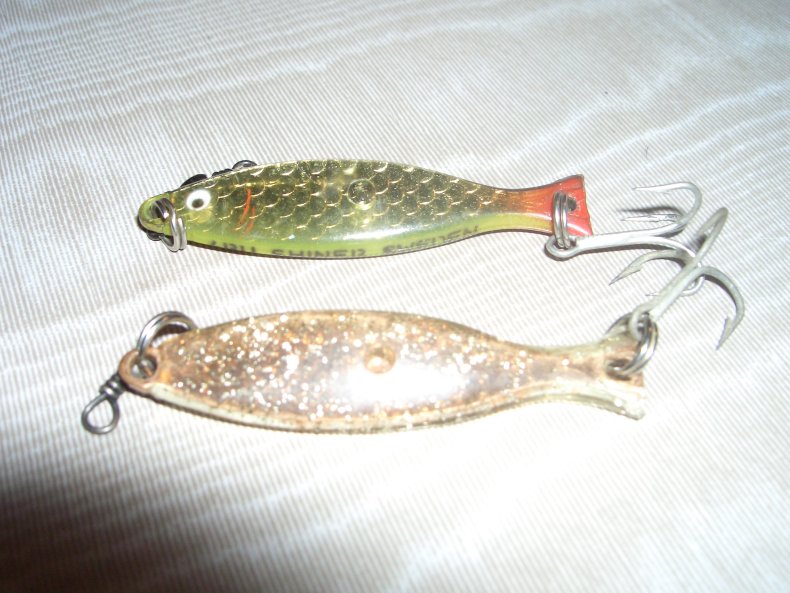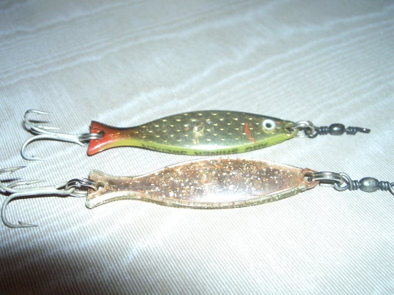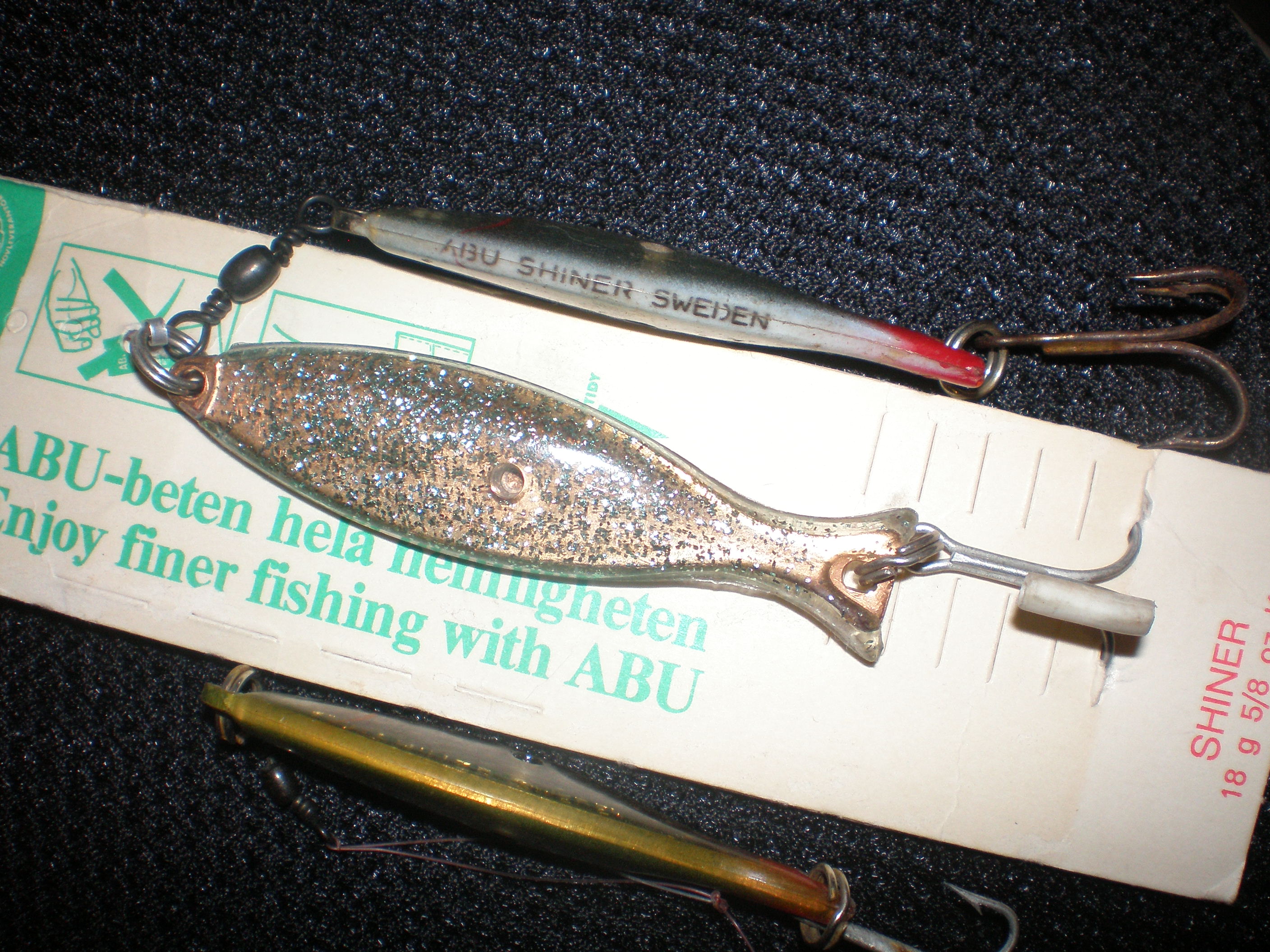 Olis pieni pähkinä Abu tietäjille. Ylempänä verrokkina Abu Shiner, alempana "samasta" muotista tehty uistin jossa ei lue mitään. Lisäksi ei ole suomukuviota eikä silmää niin kuin Shinerissä. On vaan jotain hilettä. Onko Abu tehnyt tuollaisia, vai olisko toi joku kotimainen tuotos? Löytyi vanhasta pilkkikukkarosta jossa oli Ässiä, Tuuloksia, hakkeja ym. vanhoja pilkkejä.???