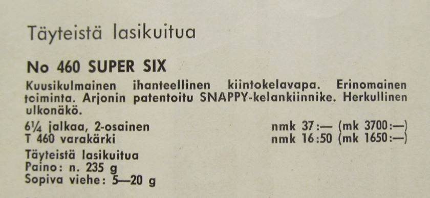 Vuoden 1961 prosyyrissä ainut 6-kulmainen mutkavapa on #470 "Fight" 6 1/4' 2-os. paino 295g, viehepaino 5-20g. SpeedFix-kelakiinnike ja "erityisen pitkä kädensija".
