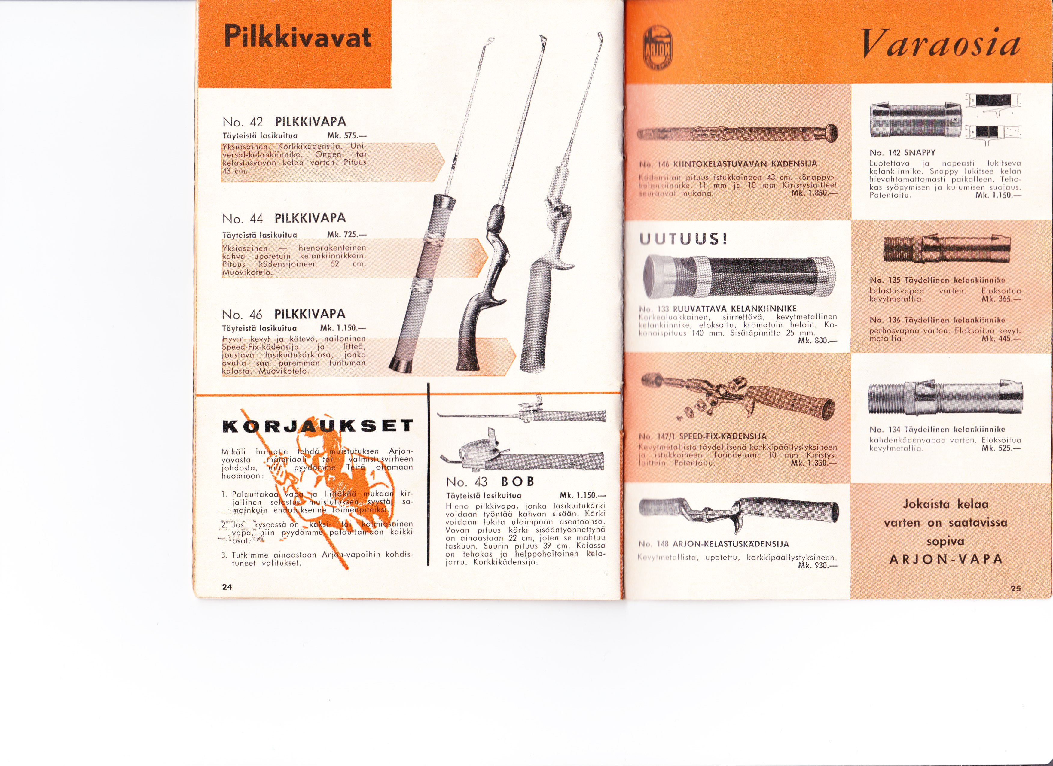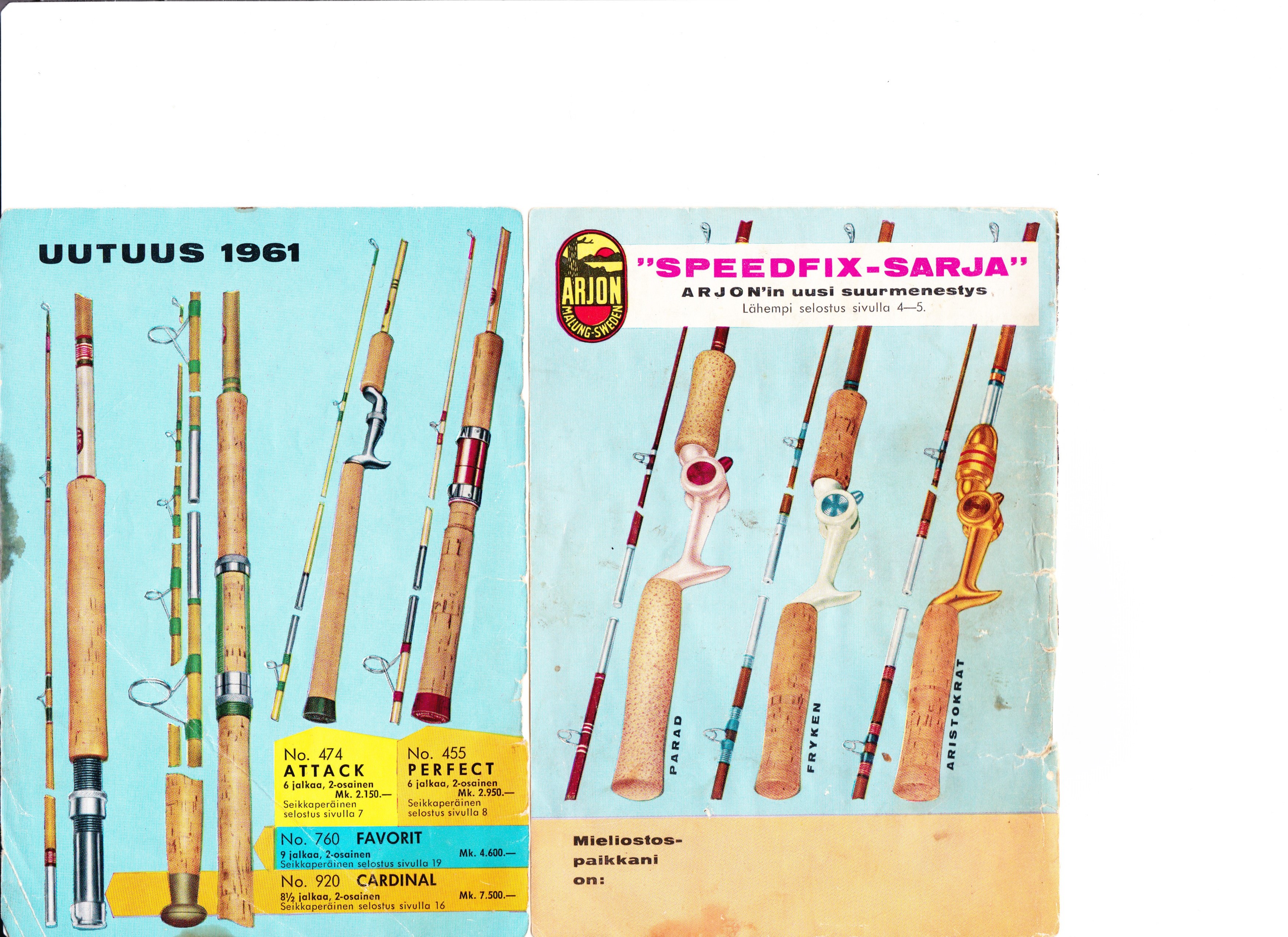 huom 2: arjonin vapojen omavaraisuus 1965. oikeasti tehdään itse.. mitens ABU (conolon? osa vavoista ainakin myöhemmin. mutta muut abu;lle vapoja tehneet..? kai teki osan itsekin. vai tekikö.. olisko peräti (kilpailija) arjonilla teettänyt jotakin..? myöhemminhän sitten lähes täysin romuttui kun siirryttiin kaukomaille)