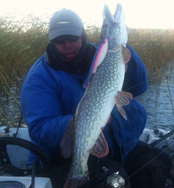 Niin... sitä siis taas aamuhämärässä suunnattiin veneelle ja... Spottiin päästyämme hyvä tuuliennuste oli heittänyt täysin häränpyllyä ja paikka oli aivan pläkä eli ei voinut kuin alkaa pyytämään tyhjää.. No hetki sitä ehdittiin pyytää kun Janne keulasta tokaisi havaineensa savivellissä salakoita. Minä siihen, että -se on sit kohta minulla kala kiinni. Olinhan juuri viritellyt siimaan Tonin tekeleen Här Pike Spinneristä tutun Tinselin. Juuri niin.. 75 cm kala oli samantein irroituksessa ja viisi minuuttia myöhemmin 85 cm kolmeplusplus. ...Ja taas oli spekuloinnin paikka, -miten voi kala ottaa tuollaiseen koukkuun, jossa on jo säleiksi räävitty sulka ja hiukan fläsää? Niinpä, itsekin yllätyn tärpeistä aina uudelleen ja uudelleen. Se taitaa kuitenkin hauella olla niin, "et se syödään mitä helposti kiinni saadaan ja joskus se pienempi houkute on isoa parempi". Niinpä kehotin keulista kaivamaan niin pienen houkutteen mitä matkassa oli. Pienen rasioiden rapsuttelun jälkeen siimaan päätyi Stormin suspi sininen villihäntä... niitä uusia iso lapaisia siis ;) Viisi tyhjää paikkaa koitetiin, tuloksena vain yksi varovainen räpsy sekä seurio. Keulakalle alkoi jo tuskastua, niin päätettiin ajaa vielä yksi hieman pidempi siirtymä, eikä suotta. Kuten niin usein, tärppi tulee yleensä melko heti, jos on tullakseen ja niin tuli nytkin. Maltillisen arpomisen jälkeen päätettiin haavia kala jo hieman hämärtyneessä illassa. Taaskin kalan koko yllätti positiivisesti vasta haavissa, melkein suurhauki.. 5,9 kg/98 cm. Tämäkin kala oli kovan yrittämisen tulos ja mieluisa palkinto tehdystä työstä. Keulamieskin oli taas täynnä hymyä ja valmis vesiltä kotiutettavaksi...