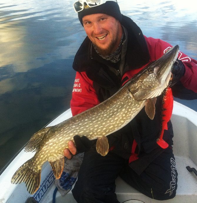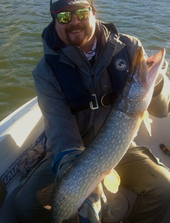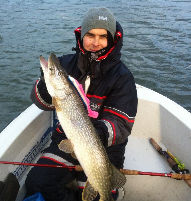 7. Päivä keulassa keikkumassa Janne. Tavanomainen aamulähtö hämärässa pelipaikoille lähivesiin ja vavat heilumaan. Kauaa ei tarvinnut testattavaa MGummin ll-kehitys versiota uittaa, kun jo puikkari sen hyväksyy. Kumin värinä tietysti se perinteikäs Härö. Kilo on aina kova! Puikko vapautukseen... ja taas alkaa se hetki päivästä,, kun ei juurikaan mitään tapahdu. No mutta... mukavassa seurassa on ilo kalastella, tutkia uusia paikkoja ja pulista joutavia, jos ja kun kala ei syö... hetki ehdittiinkin rauhassa piiskata, kun taas yllättäen Jannen vapa kumartaa syvään ja Busan Hotpikeä viedään rajusti pitkin pohjia. Kovan taistelun jälkeen kala saadaan hieman väsymään ja ohjailtua haaviin. Melko hankalasta vieheen irroituksesta selvitään kahteen mieheen kohtuu nopeasti. Kiitos Jannen kunnollisen kidanavaajan ja pitkien pihtien. Fisu hetkeksi haaviin virkoamaan, josta mammahauki kuvaan ja vapautukseen. 6,8 kg 102 cm olivat mitat, jotka saivat keulakallen tälläkerralla hymyilemään leveästi. Mikä ettei, olihan tämä jo Jannen syksyn kolmas suurhauki ja toiseksi pisin ever. Tovi vielä tyhjää pyydettiin, kunnes päätettiin siirtyä kotirantaan. Olihan minulla kalapäivä huomennakin. Selvästi jo tärppivälin pituuksista huomasi, että joulukuuta mennään.