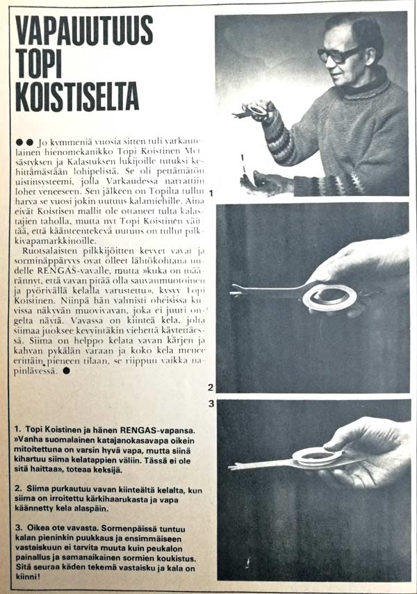 Topi Koistisen keksintöihin kuului myös Rengas-vapa, joka on idealtaan tuon Mini-Hokin edeltäjä. Se esiteltiin uutuutena M&K-lehdessä marraskuussa 1973 (kuva jutusta alempana).jlahti kirjoitti:kuva äärimmäisestä pelkistyksestä.. kyllä tuossa on ehjä, kokonainen pilkkivapa. valmistettu yhdellä valulla. "hokki mini" pituus n. 28.5 cm että ei kooltaan erityisen pieni. muistelen että ostin jostain kalastusliikkeestä hintaan 1 mk joku tarjoushinta. en ole koskaan kokeillu..