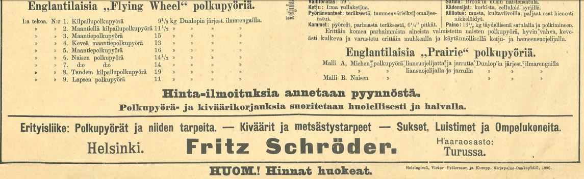 Schröderin polkupyöräkuvasto, teknisine tietoineen.