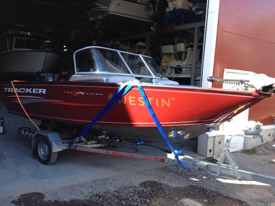 Ohessa uusi vene. Eli Tracker Pro Guide V-175 Combo, kaverina Mercuryn 115 hv nelari. Molemmat pakasta vedettyjä. Ensisavut vielä ottamatta mutta eiköhän se tässä viikonlopun aikana onnistu? Huomenna vielä keulakoneen vaihto tehokkaampaan ja ensi viikolla parit monitoiminäytöt ja side image scan -moduuli paikoilleen niin alkaa olemaan valmista.