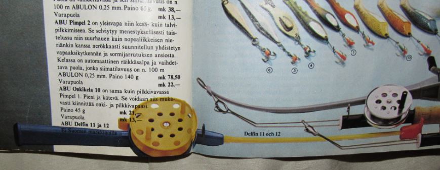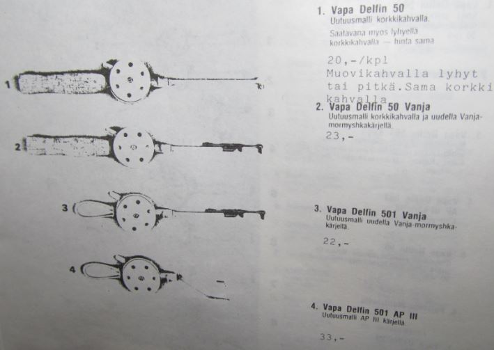 Olen aloitellut 80-luvun alkupuolella 50mm delfineillä, jäykällä ja morri-kärjellä. Silloin osassa oli tuo 1979 kuvassa ollut muovitulppa kahvassa ja osissa puinen/korkkinen tulppa. Muovinen oli niin tiukka ettei sitä tahtonut saada auki, korkkinen niin löysä, että ne on kaikki tippuneet ja hukkuneet.