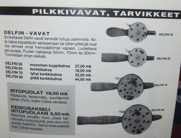 Minun ensimmäinen Delfiini 70-luvulla oli punainen. Kalasääski ( mainoksen mukaan ei -sääksi) oli tummemman punainen sävyltään, ja siinä oli puolan kiinnitysruuvi ristipää, Delfinissä taltta.