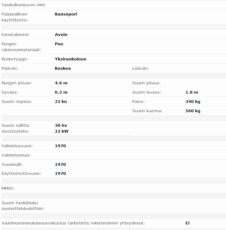 Niin muuten joo, minulle tuo Trafin pitämä venerekisteri tuli tutuksi vasta tänä vuonna. Yksi veneeni on nyt siellä rekisterissä ilman moottoria ja kun siihen moottorin laitan, sen kun lisään moottorin tiedot sinne. Silti perustiedoissa on, mikä on max moottoriteho. Eiköhän se tieto ole siellä ja pysyy, vaikka laittaisi pienemmän. Suurempi ei oletettavasti menisi läpi, josta on ollut viime aikoina uutisiakin. Toisin taisi olla maistraatin aikoina.