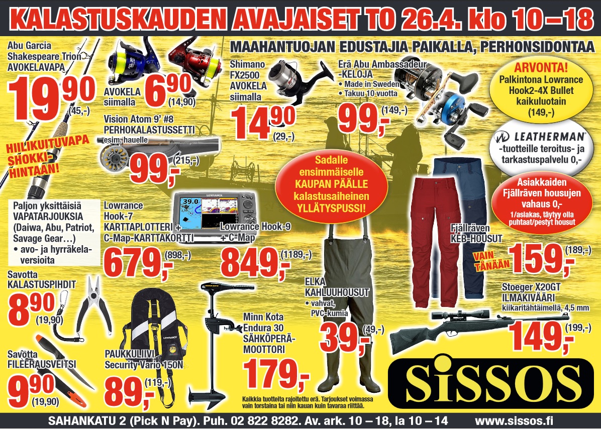 Sissoksen perinteisissä kalastuskauden avajaisissa on taas erinomaisia tarjouksia ja ne jatkuvat ainakin ensi tiistaihin asti. Esimerkiksi erä Ambassadeur-hyrräkeloja (Made in Sweden), muita keloja, muutama Humminbird Helix demolaitepoisto, Lowrance Hook-kaikuplotterin karttakorttikampanjat, sekalaisia vapoja ja paljon muuta. Tuotteita rajoitettu määrä, eikä tarjoukset koske tilaustuotteita. Leatherman-teroitus ja Fjällräven housukamppis ei enää voimassa.