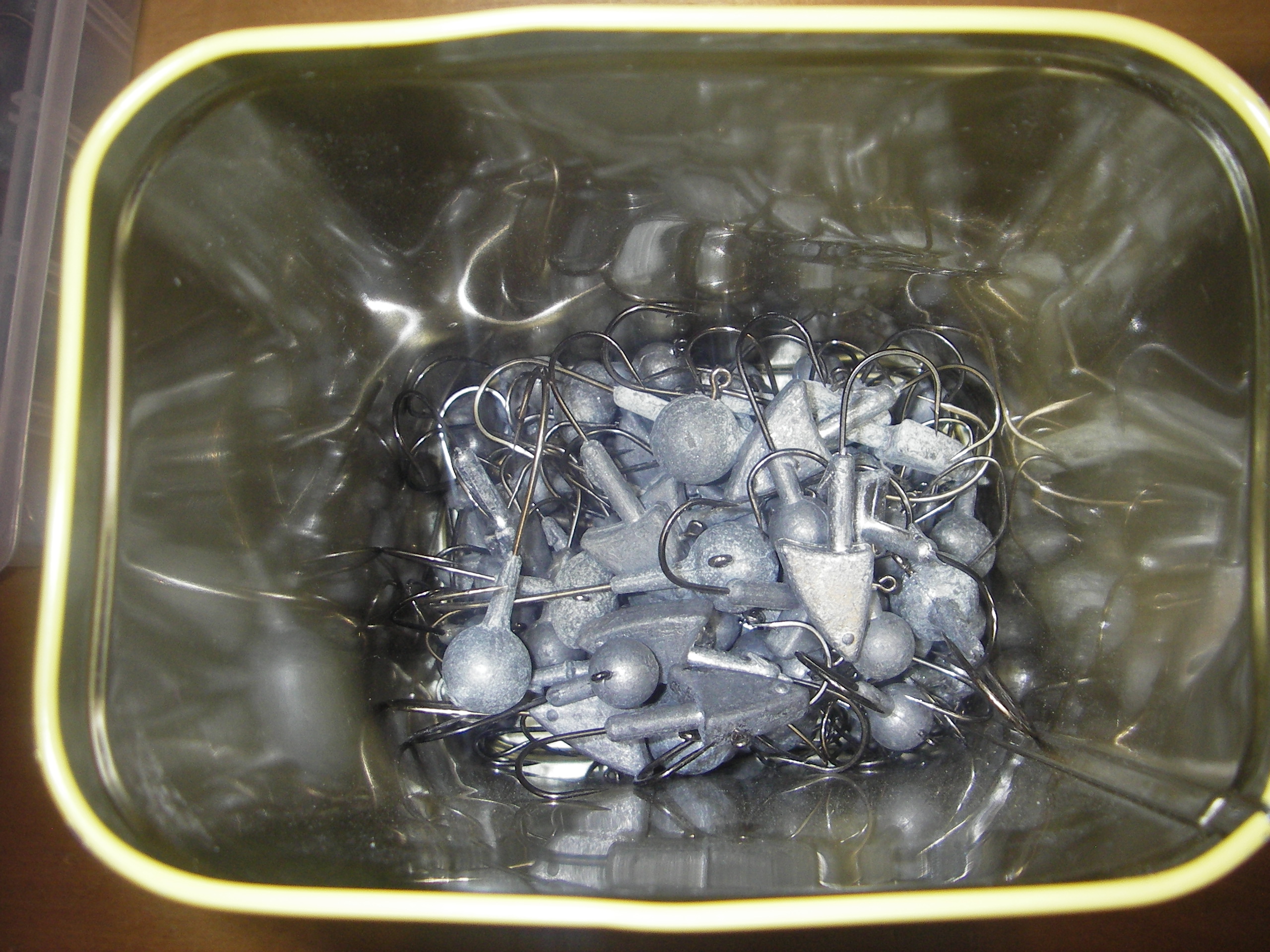 Tähään peltilaatikkoon on kerätty jigipäitä aika läjä. Osa on täysin hapettuneita ja saattaa olla mukana, että siinä on seassa näitä valmiiksi valuvirheellisiä kaverilta ilmaiseksi saatuja jigipäitä vuosia sitten, tuli jigipäiden teossa ongelmia. Sitten on semmoisia, että pinta on tummunut, on hapettumia ja jigipään pinta tuntuu sormiin tosi nahkealta. Osa on on ollut valmiiksi tämmöisiä tummaa jigipää laatua. Vaikka suurinta osaa jigipäistä on säilytetty lämpimässä kellarissa ja waken laatikossa, silti ne ajan myötä keräävät epäpuhtauksia ja oma teoria on, että lyijyiset jigipäät voi reagoida keskenään, kun hieroutuu eri valmistajien jigipäät ja lyijyseokset keskenään.