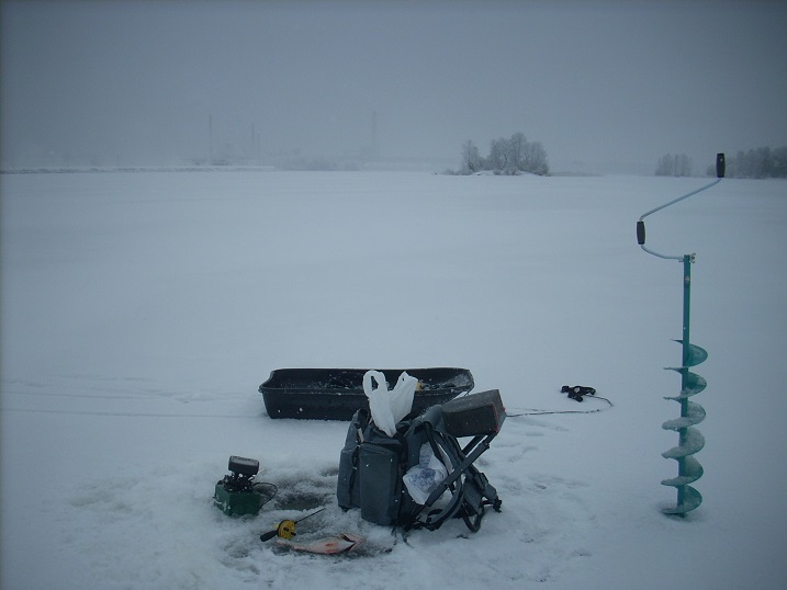 Kuvasta näkyy myös "uittotyyli", jolla viikonlopun kalat tuli. Onki pulkkaan ja hörppimään kahvia, samalla odottaen jos kaloja kiinnostaisi välivedessä odottava makupala.