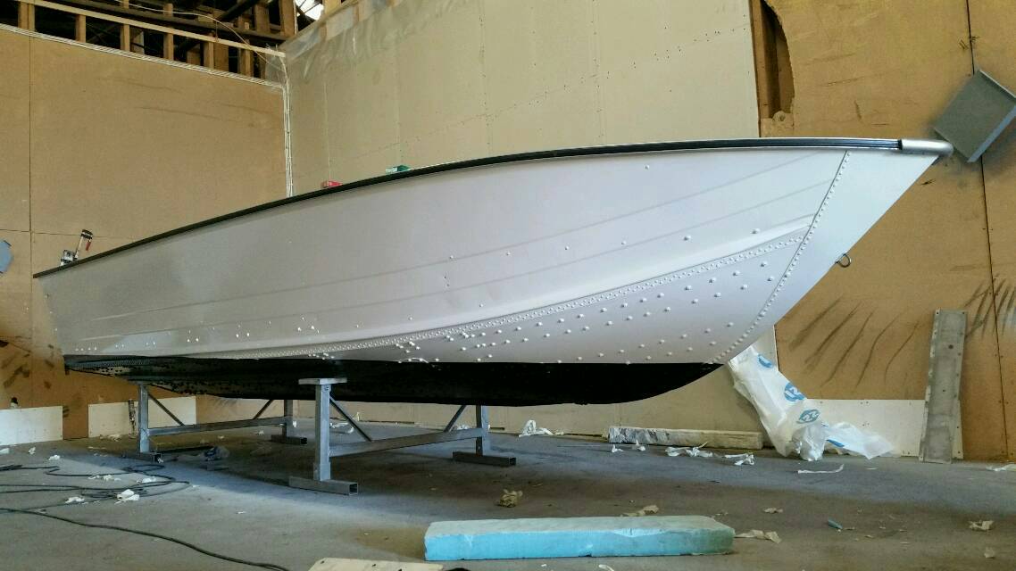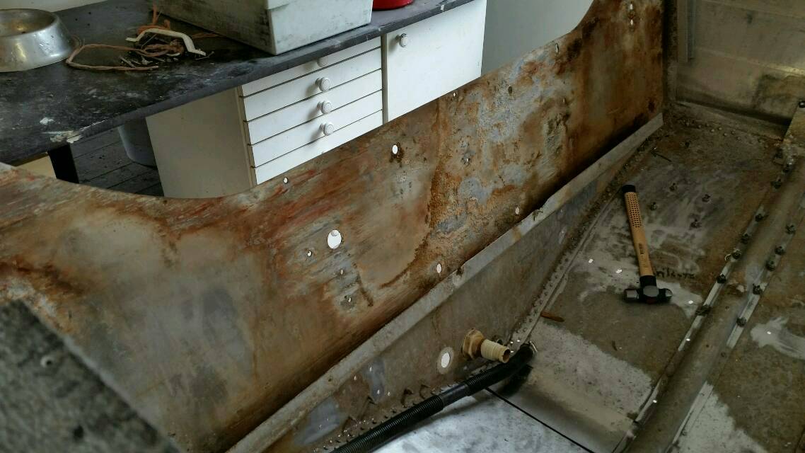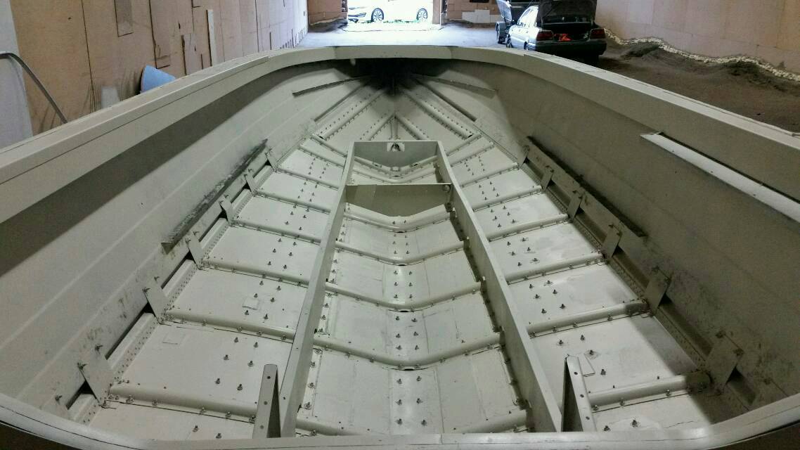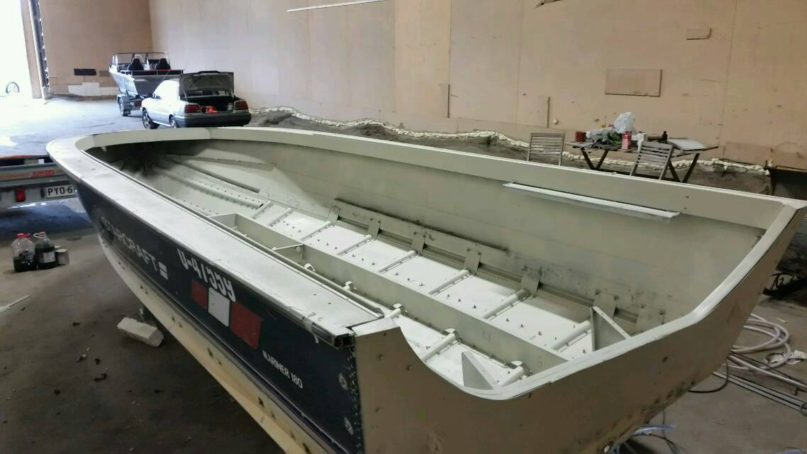 Veneen pohja vahvistettiin 2mm merialumiinilevyillä niistä kohdista, missä oli vähänkin alkuperäinen alumiini hapettuneen näköinen.