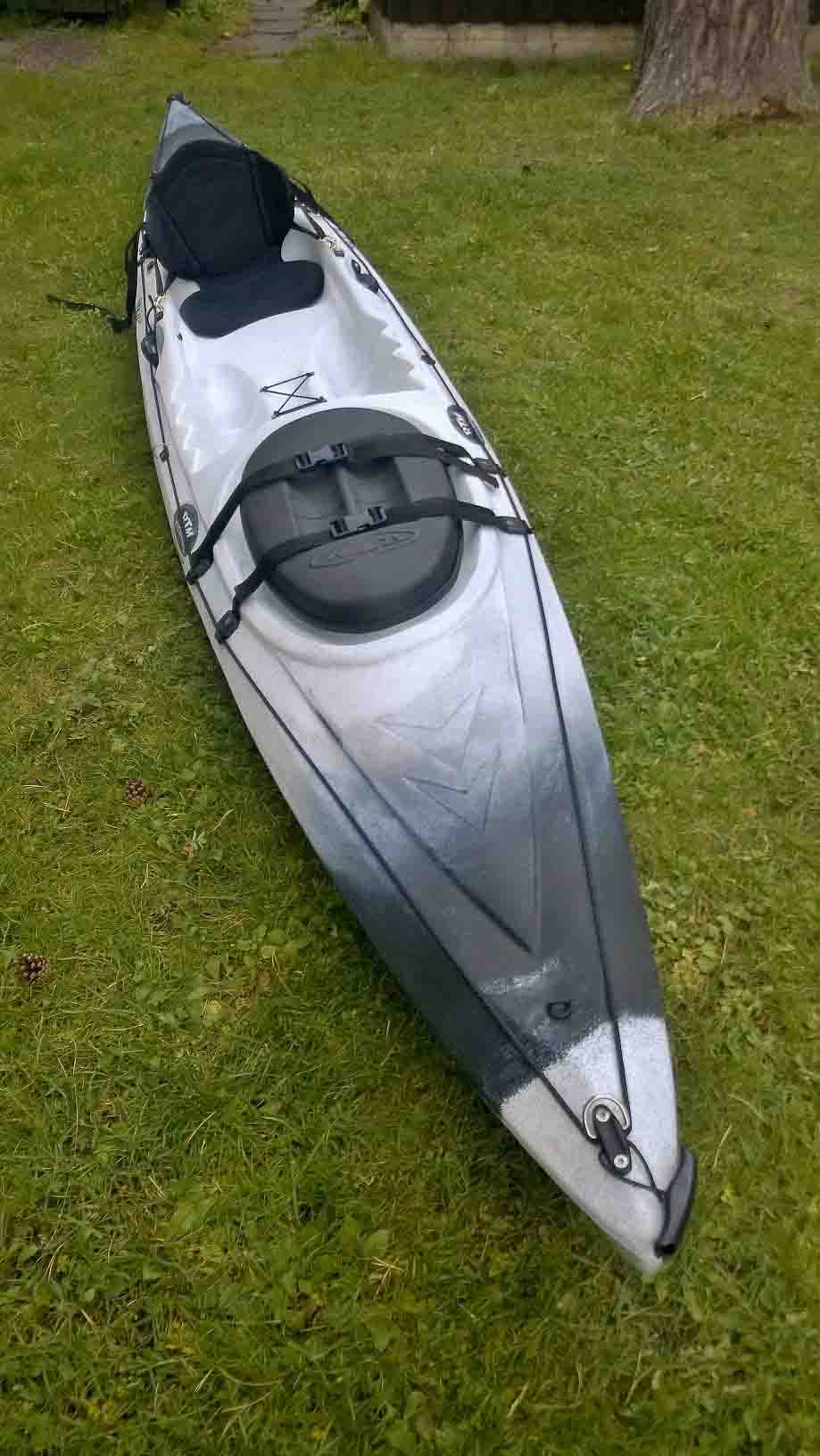 Puolentoista kuukauden pähkäilyn ja nettisurffailun jälkeen tuollainen löytyi pihalle. Melkoisesti oli erilaisia vaihtoehtoja "viivalla" ja harkinnassa, mutta lähes aina jotain muuta kajakkia ihmetellessä, palasin loppupelissä tähän nopeahkoon ja kevyeen (24kg, 4.5m X 67cm) Tempoon.