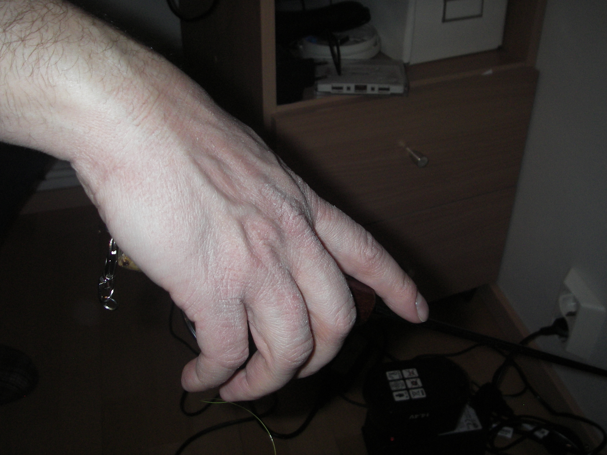 Löytyi tuommonen erään metallimiehen vuosia sitten hitsaama takahaarukka. Vavan sisällä on noin 5-6 mm ontto putki, 8 mm millin kalustepuutapista hion liiat pois ja laitoin tuonne takahaarukan kanssa putken sisään tukemaan liimausta. Epoksia paljon sisään ja sitten tappi ja takahaarukka sisään. Liimalla vielä päällystin vavan perän, ei olisi tarvinnut liimaus oli muutenkin tukeva. Vielä pitää hioda takahaarukan hitsausta tai heittää vaan päälle mehumaijaletkua tai kutistesukkaa. Takahaarukan mitta on 10 cm, takahaarukasta olisi voinut ehkä nipsaista vielä 1 cm, pois, niin olisi 9 cm, ehkä silloinkin siimapakan ja kädensijan väliin olisi sopinut rukkaskäsi. Tarkempi mittaus ja duunattu vavan paino kutistesukkineen, 54 g, entinen paino oli 55 g.