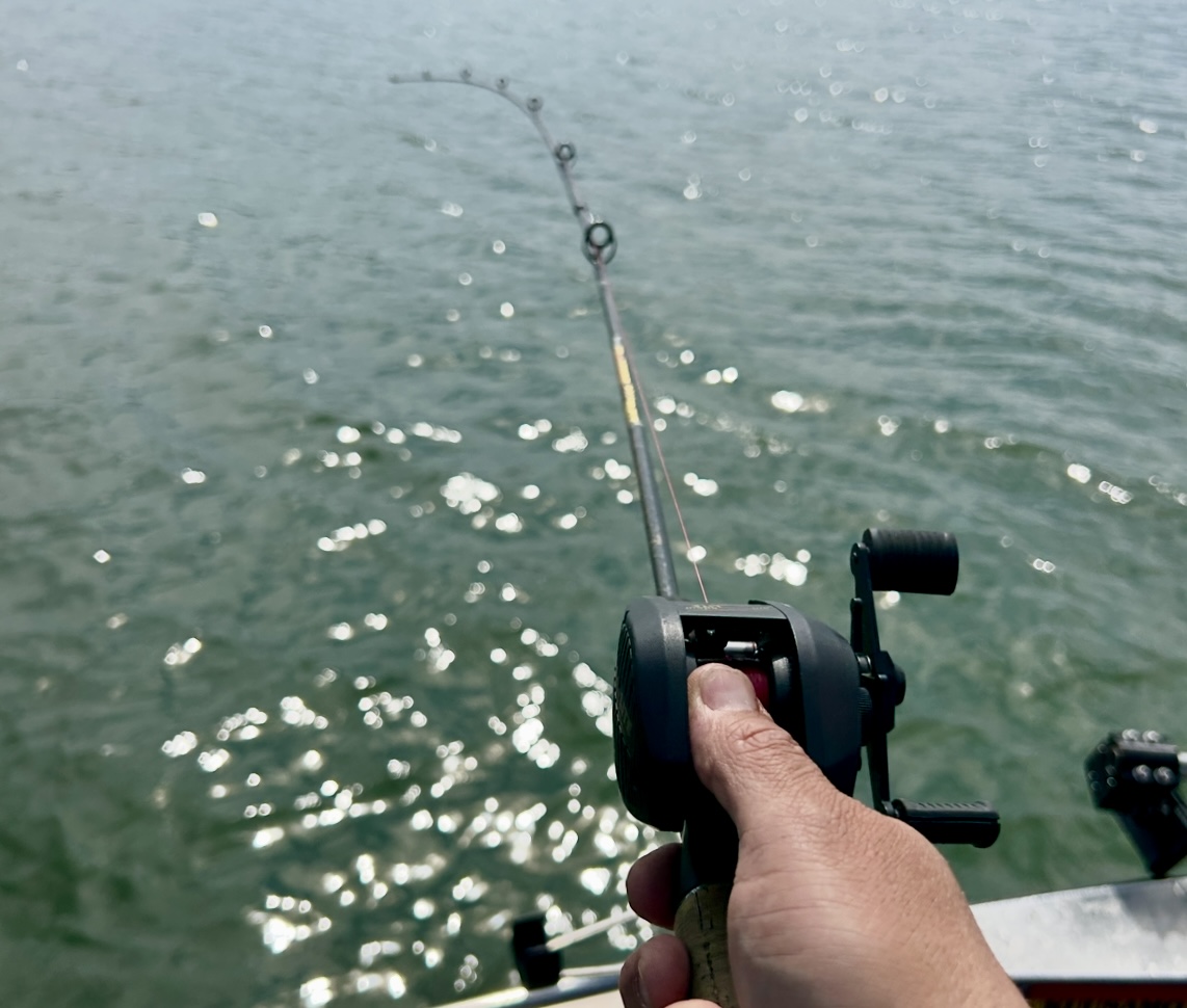 Sitten kaverin rakentamaan Abu ”60 Duettiin” iso kala. Kala pääsi veneen alle, enkä päässyt kiertämään kun kaveri vaihtoi kuorihousuja. Peruke poikki. Mepps Aglia 5 kalan suuhun.