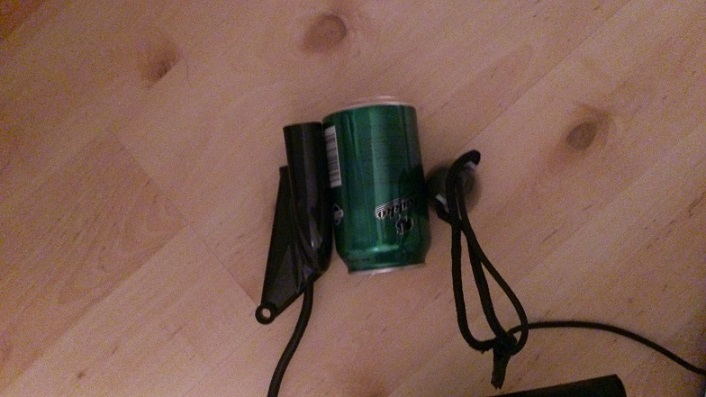 Ylimääräinen johto on teipattu nipulle ja nippu on yhdessä pienen n. 200g li-ion akun kanssa kaiun kanssa samassa laatikossa. Akulle on tehty plugi nopeaa liittämistä varten.