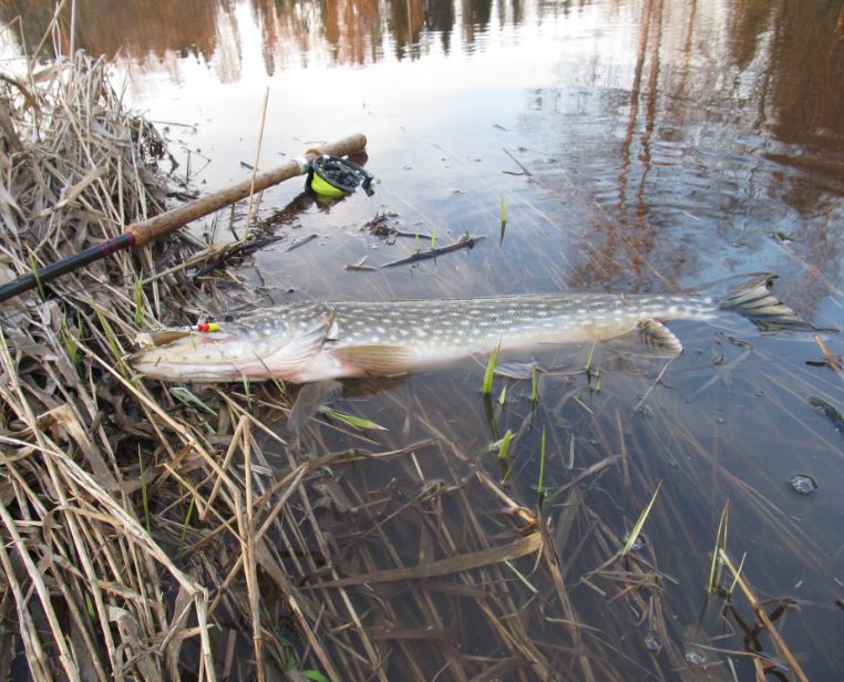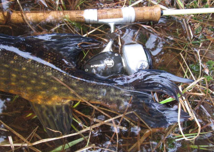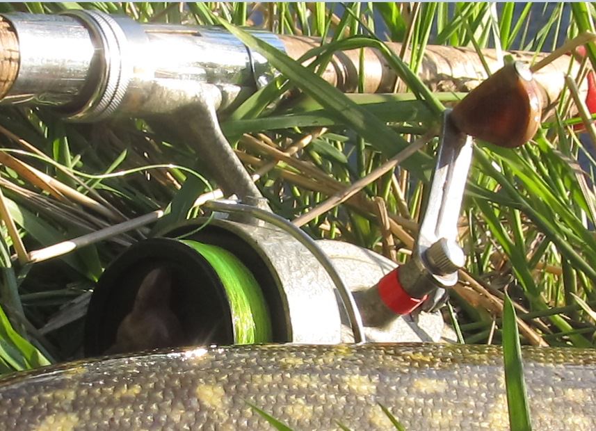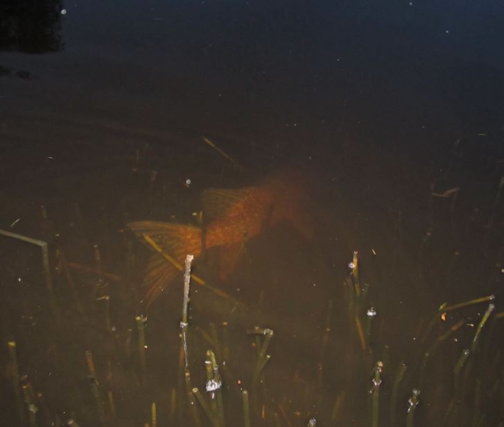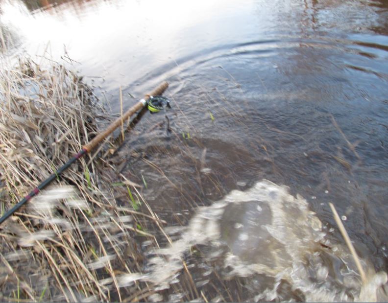 yksi iso (lampihaueksi. n. 4 - 5 kg ) lähti rannasta karkuun, selkä viiletti pinnassa.