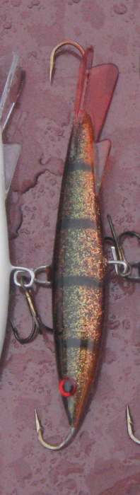 Runkopituus muistaakseni oli n.75mm ja siihen koukut päälle eli aika iso. Ahventa näillä kalastetaan,mutta saattaisi varmaan vaikka taimenkin ottaa.