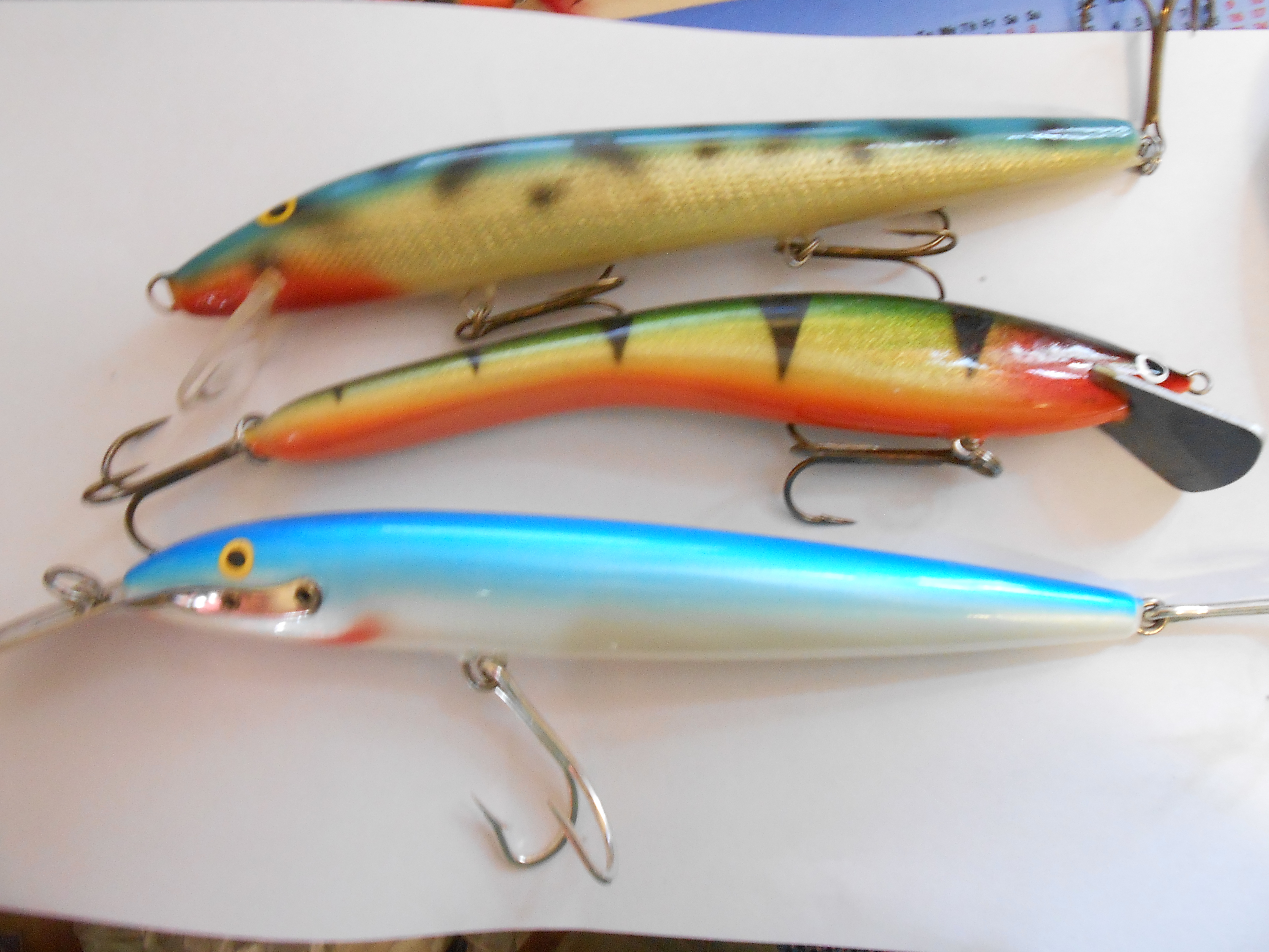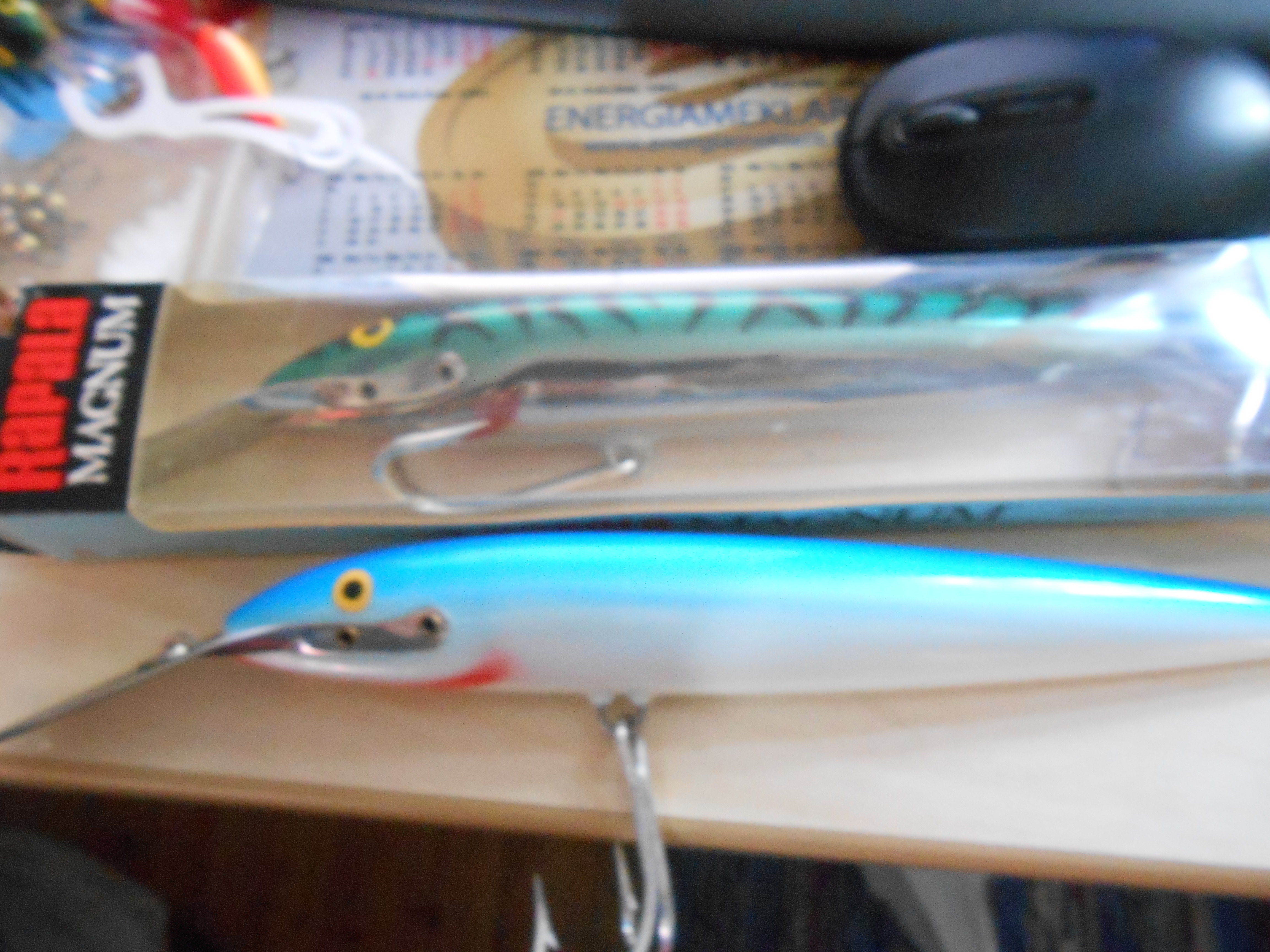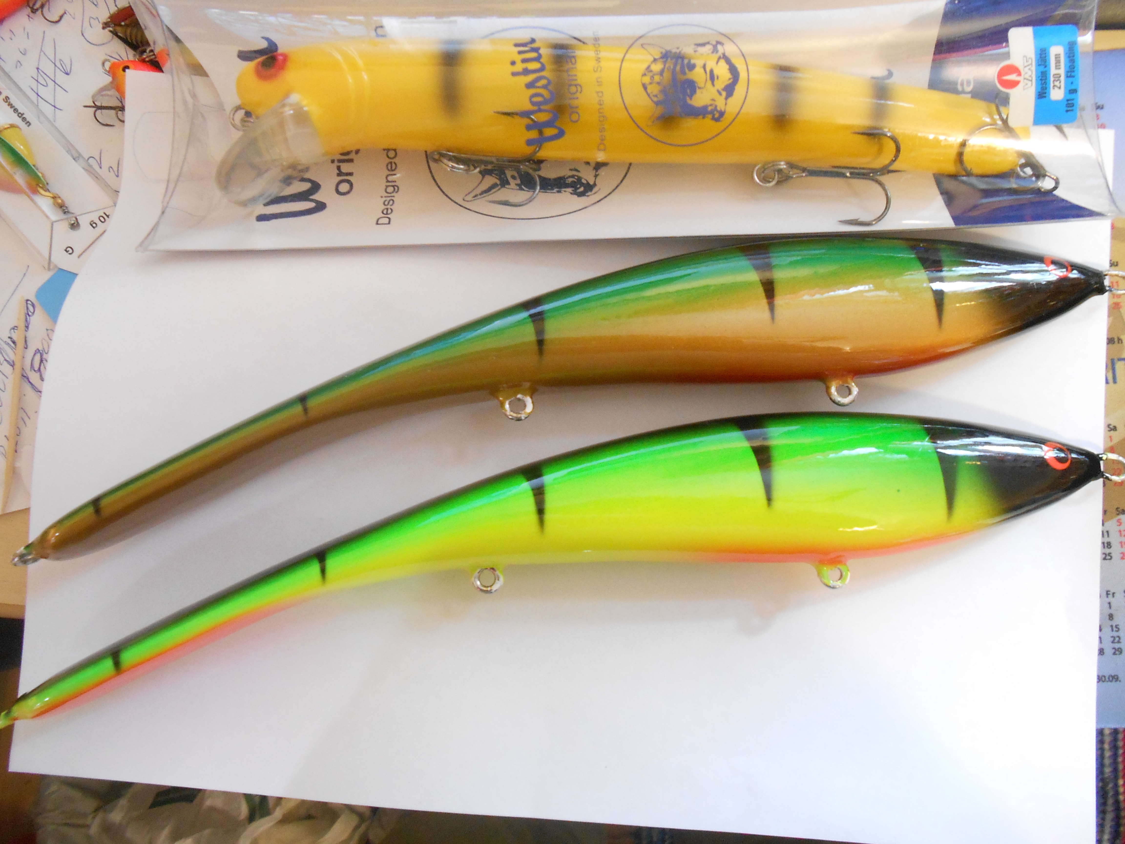 Tällaiset tuli tehdyksi kolmisen vuotta sitten, 20 cm (runko), n. 40 g. Kuvassa vielä uusia, osalla nykykunto hauenpuremissa. Jos kauheasti kiinnostaa, niin saatan luopua.