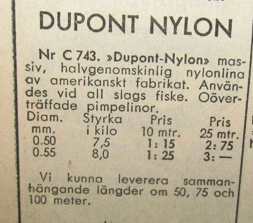 Damyl "synteettinen gut, jota voi käyttää kaikessa kalastuksessa", siis yksisäikeinen, oli myös myynnissä jo 1940-luvun alkupuolella. Olen aiemmin postannut tämän kuvan tänne, mutta otetaan kertauksena, kun liittyy aiheeseen. Tämä mainos on Sportfiskaren-lehdestä vuodelta 1943.